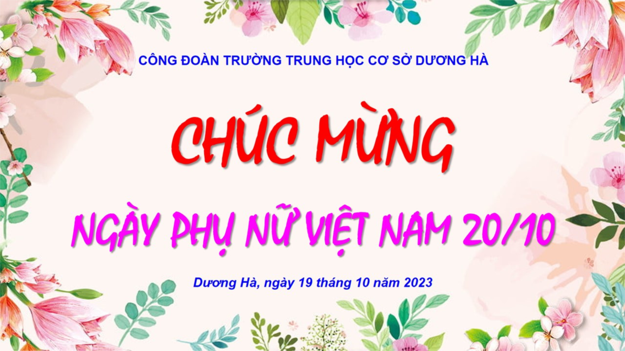 Sáng ngày 20/10, Côngđoàn trường THCS Dương Hà long trọng tổ chức lễ kỷ niệm 93 năm ngày thành lập Hội LHPN Việt Nam (20/10/1930 - 20/10/2023). Xin gửi đến các bà, các mẹ, các cô giáo - những người phụ nữ tuyệt vời của chúng ta những lời chúc tốt đẹp nhất và những tình cảm trân trọng, yêu thương!