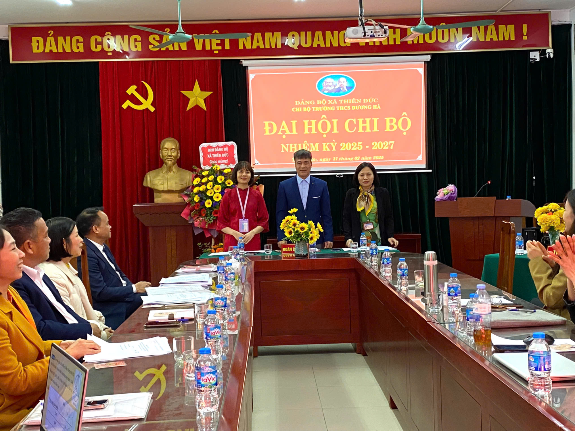 Phát biểu chỉ đạo tại đại hội, đồng chí Nguyễn Văn Đức – Phó Bí thư Thường trực Đảng ủy xã Thiên Đức đã ghi nhận những thành tích của chi bộ trong nhiệm kỳ qua, đồng thời chỉ ra những nhiệm vụ trọng tâm mà chi bộ cần tập trung trong nhiệm kỳ tới, đặc biệt là công tác giáo dục, nâng cao chất lượng giảng dạy, phát triển đội ngũ giáo viên, và củng cố công tác xây dựng Đảng.