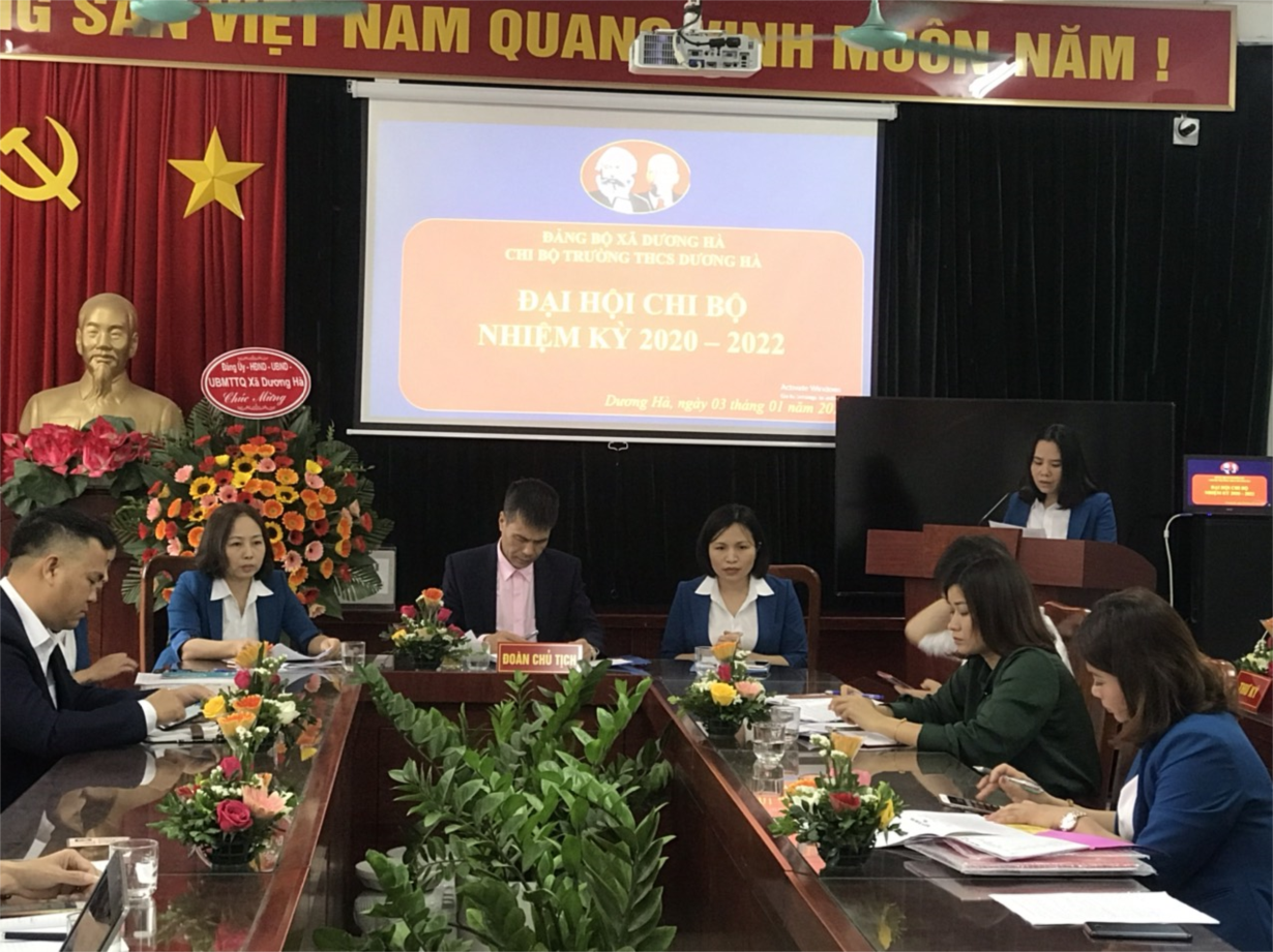 Thực hiện Kế hoạch số 93-KH/ĐU ngày 02/08/2019 của Đảng ủy xã Dương Hà, Hướng dẫn số 05- HD/ĐU ngày 11/ 09 /2019 của Đảng ủy xã Dương Hà về tổ chức Đại hội chi bộ trực thuộc đảng bộ xã Dương Hà, nhiệm kỳ 2020 - 2022. Ngày 04 tháng 1 năm 2020, chi bộ Trường THCS Dương Hà long trọng tổ chức Đại hội chi bộ nhiệm kỳ 2020 - 2022.