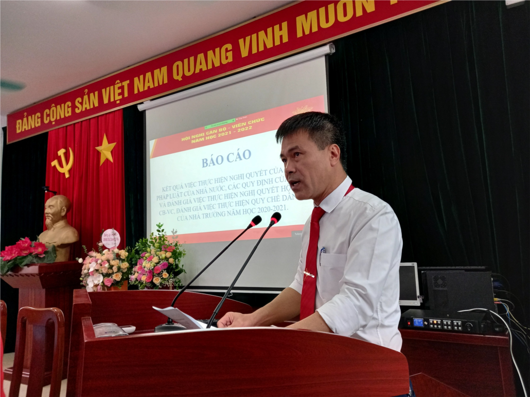 Để thực hiện tốt nhiệm vụ năm học 2021 - 2022, được sự nhất trí và chỉ đạo của PGD - ĐT Huyện Gia Lâm, được sự nhất trí của Chi bộ cho phép trường THCS Dương Hà tổ chức Hội nghị cán bộ viên chức lao động năm học 2021 - 2022 nhằm đánh giá kết quả thực hiện Nghị quyết: Quy chế dân chủ năm học 2020 – 2021 và triển khai nhiệm vụ năm học 2021 - 2022, đồng thời ký cam kết trách nhiệm giữa Công đoàn và nhà trường, phát động phong trào thi đua và giải đáp những thắc mắc của cán bộ viên chức trong nhà trường, giúp nhà trường thực hiện tốt nhiệm vụ năm học. Thay mặt cho đoàn Chủ tịch, đồng chí Lê Hồng Giang – Bí thư chi bộ- Hiệu trưởng nhà trường đã lên báo cáo kết quả thực hiện trách nhiệm, nhiệm vụ của Hiệu trưởng nhà trường, kết quả thực hiện nhiệm vụ nhà trường, thực hiện Nghị quyết hội nghị cán bộ viên chức năm học 2020 -2021, phương hướng nhiệm vụ năm học 2021- 2022. Sau đó là các Báo cáo tổng kết phong trào thi đua năm học 2020-2021. Kế hoạch chương trình thi đua năm học 2021- 2022, Báo cáo kết quả hoạt động của Ban thanh tra nhân dân năm học 2020 - 2021 và kế hoạch công tác năm học 2021- 2022.