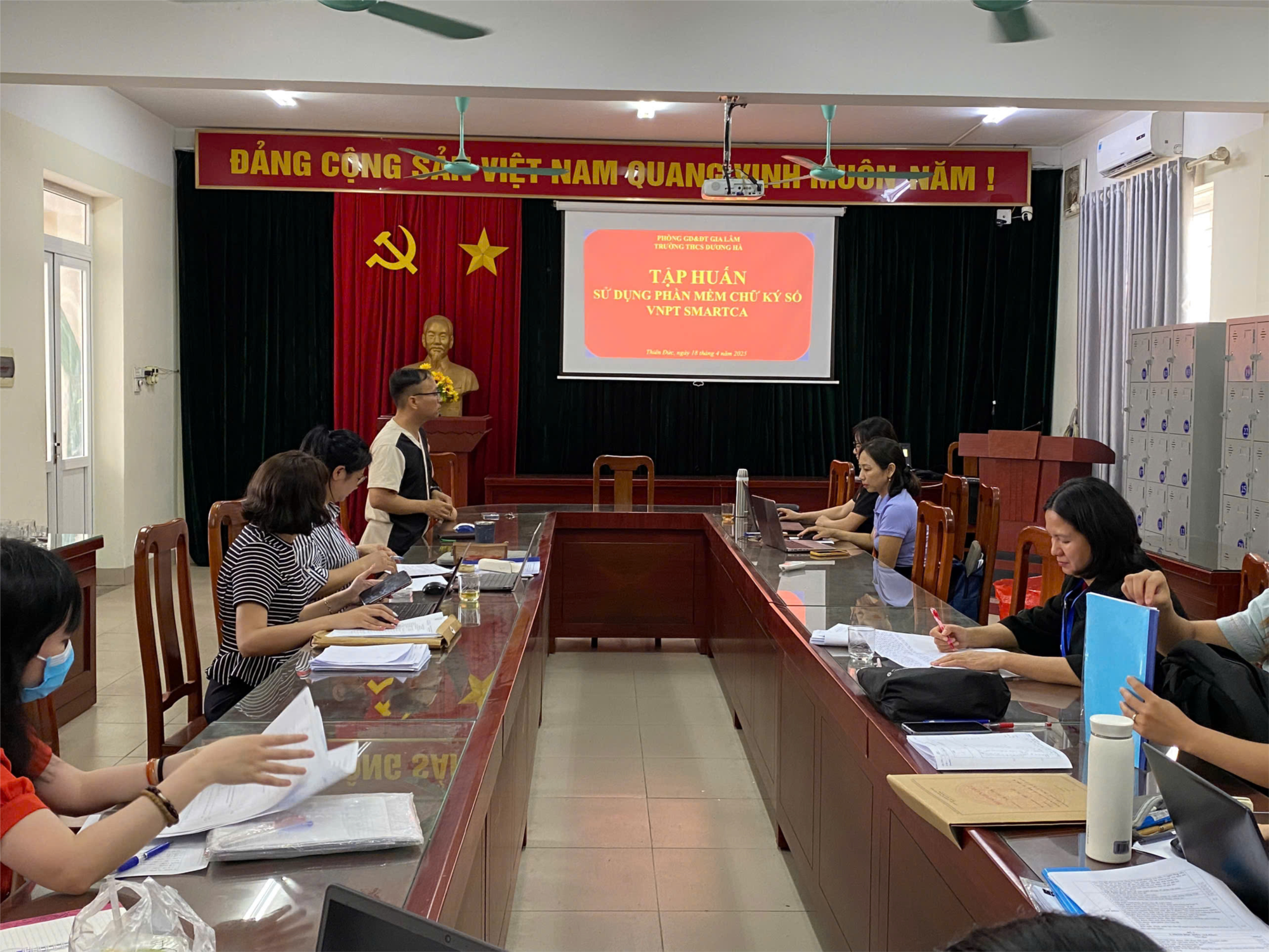 Thực hiện kế hoạch chuyển đổi số trong giáo dục và nhằm đáp ứng yêu cầu ứng dụng công nghệ thông tin trong công tác quản lý hồ sơ học sinh, chiều ngày 18 tháng 4 năm 2025, vào lúc 15 giờ 30 phút, trường THCS Dương Hà đã tổ chức buổi tập huấn sử dụng phần mềm chữ ký số cho toàn thể cán bộ, giáo viên nhà trường.